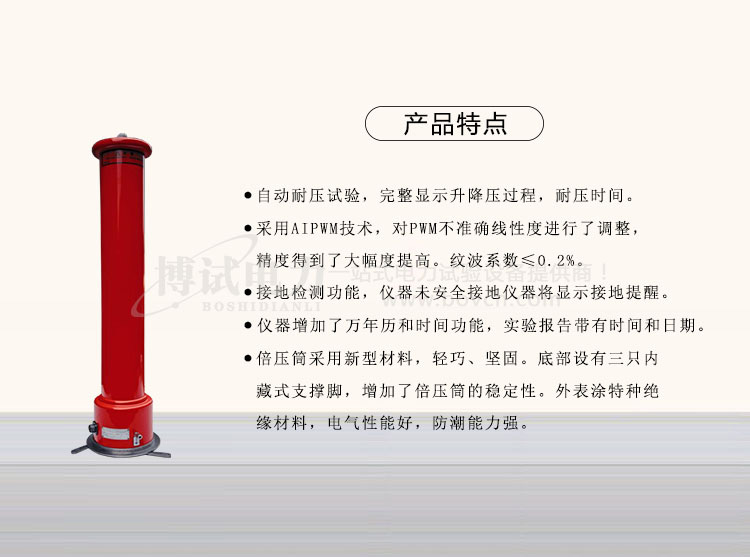 6、倍壓筒采用新型材料,輕巧、堅固。底部設(shè)有三只內(nèi)藏式支撐腳,增加了倍壓筒的穩(wěn)定性。外表涂特種絕緣材料,電氣性能好,防潮能力強。