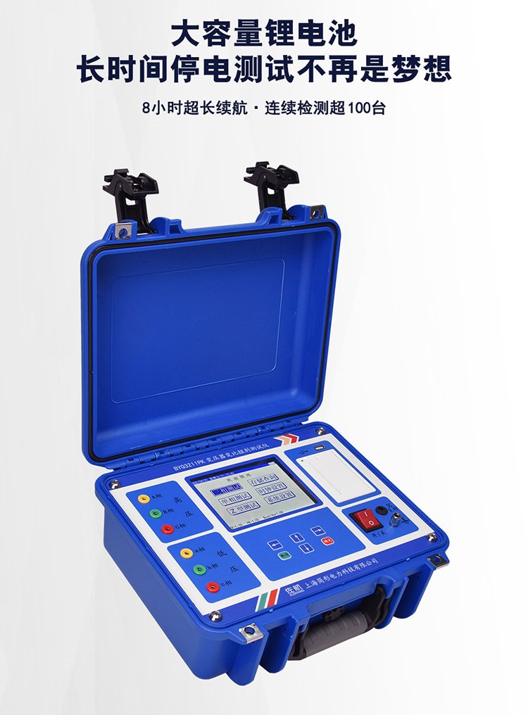 1. 鋰電池供電或者220V交流供電自適應(yīng),一次充電,可連續(xù)進(jìn)行100臺(tái)以上變壓器變比組別測(cè)試,測(cè)試過程簡(jiǎn)單、方便。