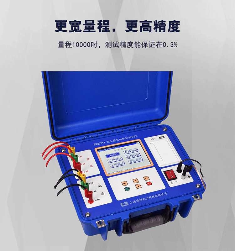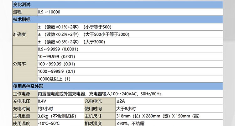 3. 量程寬、精度高,變比測(cè)量范圍可達(dá)10000,且值為10000時(shí)測(cè)試精度保證0.3%。