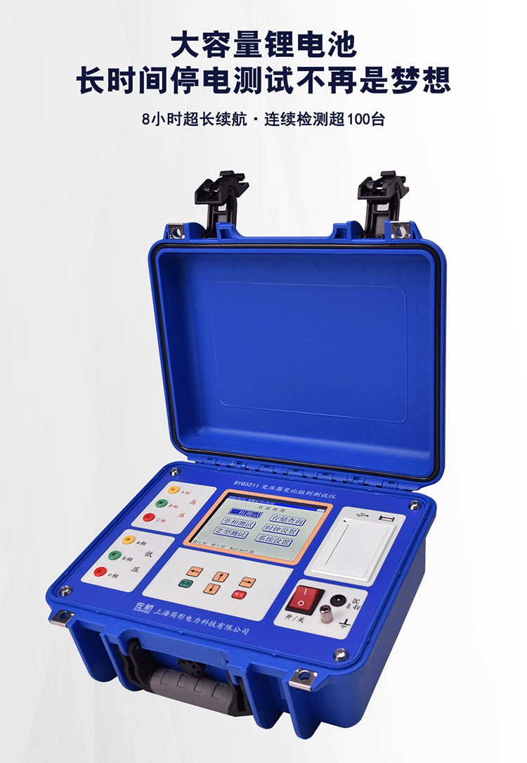 1. 鋰電池供電或者220V交流供電自適應(yīng),一次充電,可連續(xù)進(jìn)行100臺(tái)以上變壓器變比組別測(cè)試,測(cè)試過程簡單、方便。