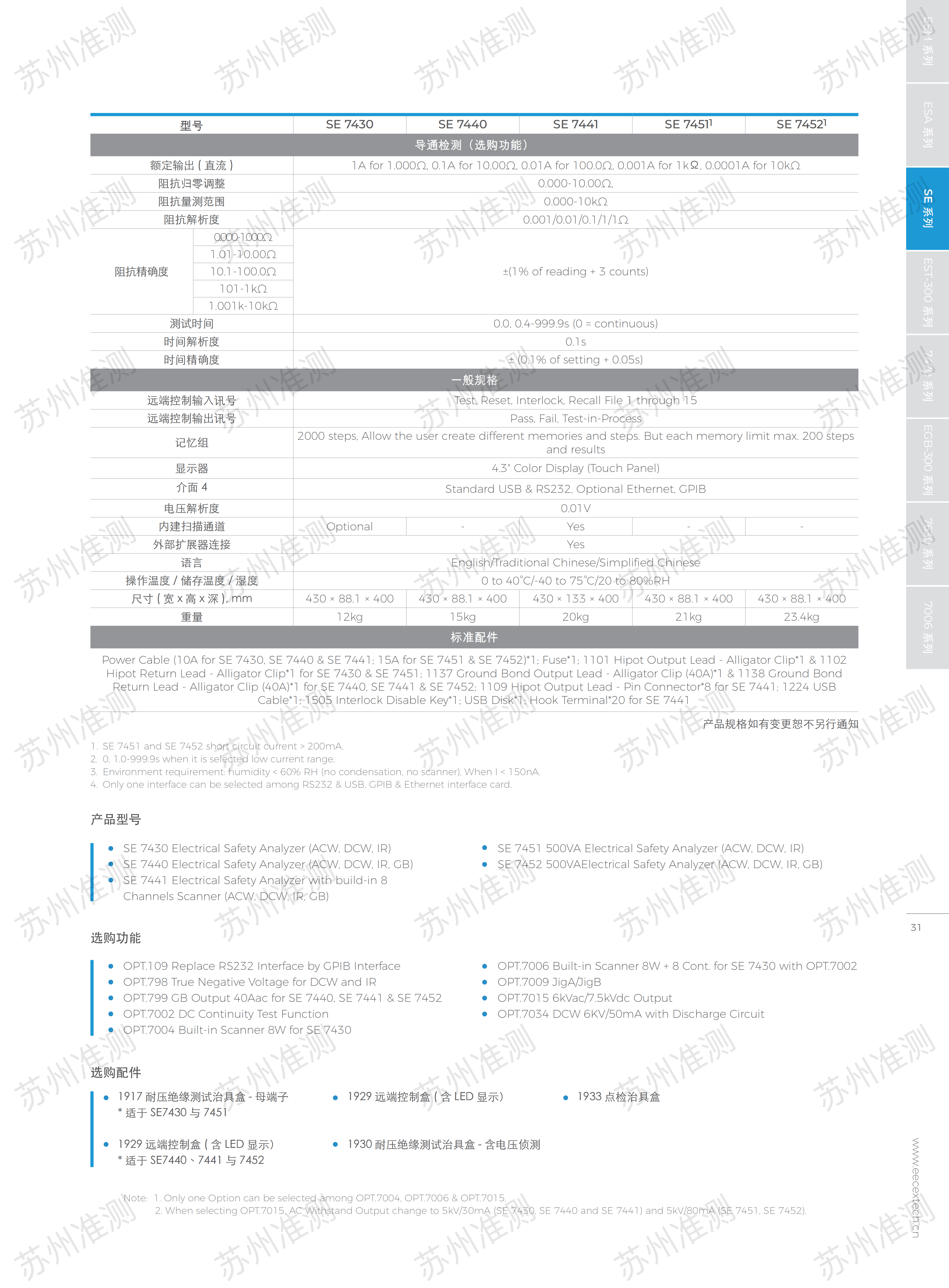 新一代的 SE 系列四合一安規(guī)測(cè)試儀效能再升級(jí),結(jié)合了業(yè)界指標(biāo)性的ARC 電弧偵測(cè)功能,高精度四線測(cè)量及真實(shí)負(fù)電壓測(cè)試,進(jìn)一步強(qiáng)化安全性,和輸出功率達(dá) 500VA的便利性。完善配套的測(cè)試儀更加符合現(xiàn)今產(chǎn)業(yè)多變的實(shí)時(shí)需求。在操作接口上,搭配4.3吋多點(diǎn)觸控面板及條形碼掃描鏈接,使用上更簡(jiǎn)潔有效率。