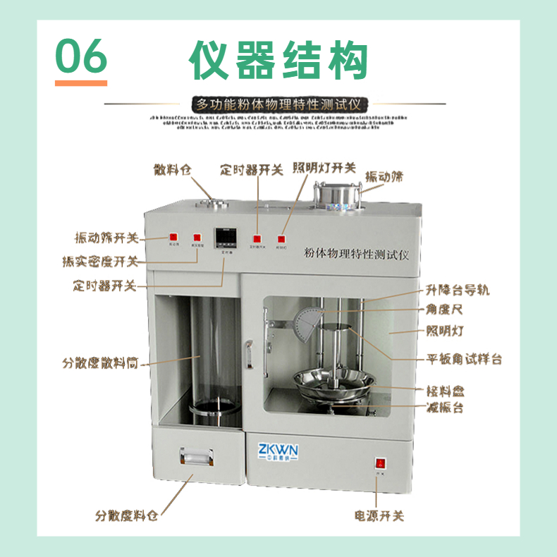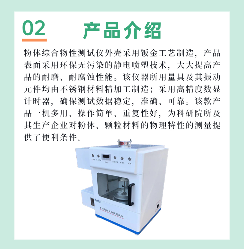 粉體綜合物性測(cè)試儀外殼采用鈑金工藝制造,產(chǎn)品表面采用環(huán)保無(wú)污染的靜電噴塑技術(shù),大大提高產(chǎn)品的耐磨、耐腐蝕性能。該儀器所用量具及其振動(dòng)元件均由不銹鋼材料精加工制造;采用高精度數(shù)顯計(jì)時(shí)器,確保測(cè)試數(shù)據(jù)穩(wěn)定,準(zhǔn)確、可靠。該款產(chǎn)品一機(jī)多用、操作簡(jiǎn)單、重復(fù)性好,為科研院所及其生產(chǎn)企業(yè)對(duì)粉體、顆粒材料的物理特性的測(cè)量提供了便利條件。