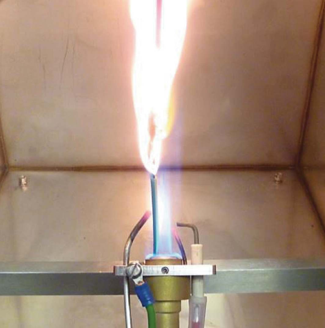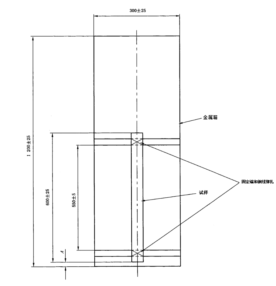 試驗(yàn)方法將一根60cm長的試樣垂直固定在前壁開通的金屬箱內(nèi),固定端上部和下部距離在550mm,固定試樣時使試樣下端距離金屬箱底面約50mm?;鹧骈L度175mm的丙烷燃燒器從距試樣的上部固定端450mm的位置上火焰錐與電纜以45度角接觸。用鋒利的物體按壓電纜表面,如果彈性表面在某點(diǎn)變?yōu)榇嘈裕ǚ刍┍砻妫瑒t表明該點(diǎn)既是炭化部分起始點(diǎn)。如果炭化部分距離固定端下部不超過50mm,則電線電纜通過試驗(yàn)。